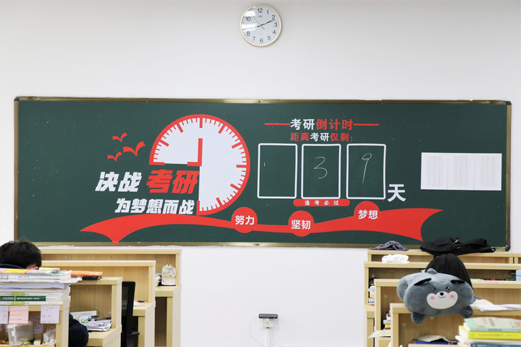 桌上的书架上放着MP3,单词书和小台灯被耳机线缠在一起,各式各样的便利贴罗列着满满当当的今日复习内容和未来目标,一边的保温杯还散发出氤氲热气......考研临近,学院图书馆走廊的木椅上随处可见摊开的资料,楼道口、大厅的角落里,甚至柱子后边,走几步便能见到或蹲着、或自带椅子坐着背书的“考研人”,他们将这些边角空间作为背书“圣地”,每天都在这一方小天地里“安寨扎营”。教学楼的考研自习室里,黑板上醒目地写着倒计时,“考研人”的脸淹没在一面面“书墙”之间,他们埋头奋笔疾书,握着手中的笔,耐心填满剩下的备战时光.....