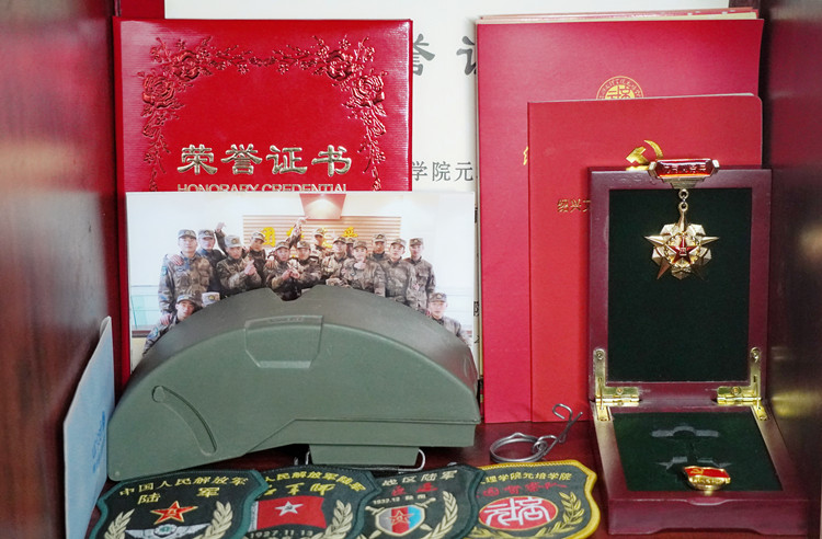 宿舍书桌的一角,整整齐齐地摆放着四枚臂章、优秀义务兵证章、一张战士们的大合照和《中国共产党简史》、《论中国共产党历史》,这是翁俊峰珍藏热血青春的“荣誉堂”。翁俊峰,传播1801员工党员,曾服役于重庆陆军野战部队,荣获“优秀义务兵”称号,现就任学院督察队队长。
