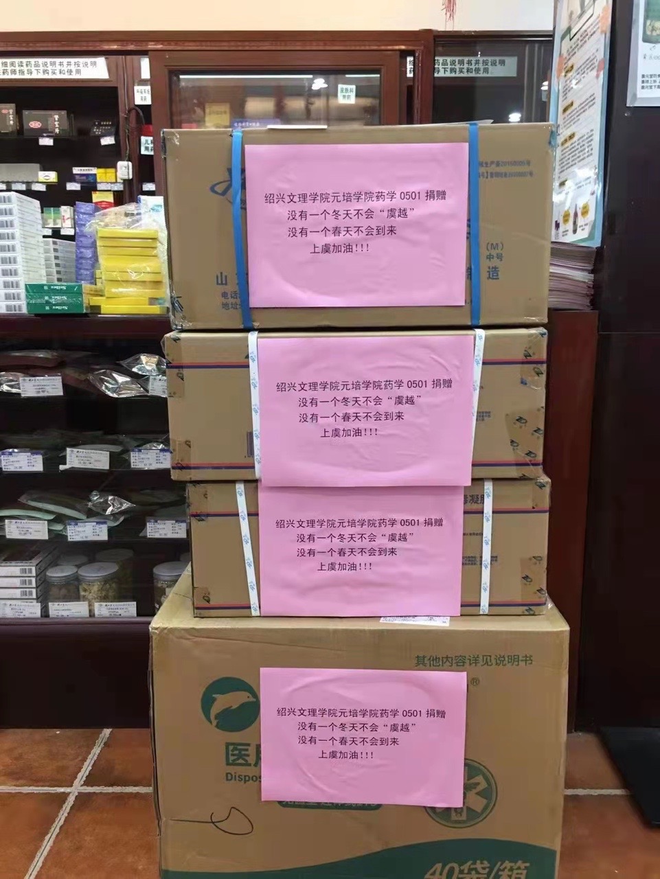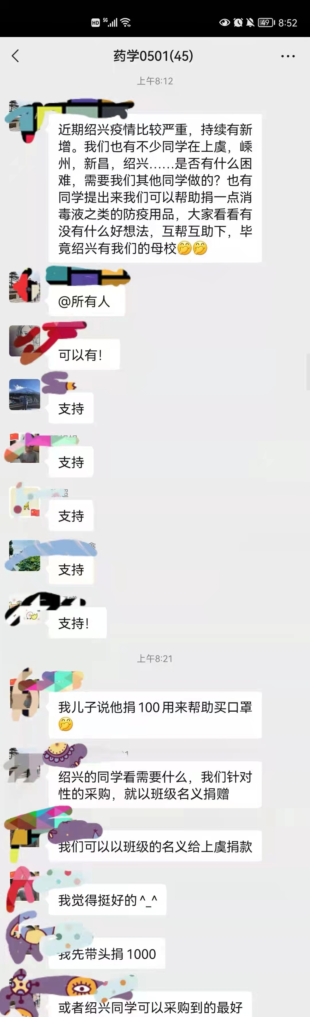 “母校需要什么?”“近期绍兴疫情比较严重,是否有什么困难需要帮助?”“需要防疫用品吗?”“别怕,我们医院兵强马壮!”“大家可以互帮互助,毕竟绍兴也有我们的母校。”“大家互帮互助,共渡难关!”12月13日早上,医药与健康分院教师杜轶君刚刚打开微信,便被药学0501、药学1701两个班级群内的满屏爱心“暖”住了。药学0501班班长巴富民发起提议组织捐助后,药学0501班的梁娟娟、承雯雯、王晨曦、周伟鑫,药学07级的费晓强、王超海、杨浈,以及来自浙江、江苏、四川等全国各地的员工纷纷响应,不断地汇集起对母校和绍兴的关爱。