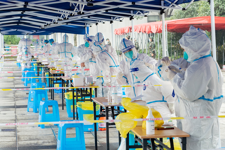 下午一点整,元培广场上,等候区、测温区、采样区、临时隔离区各区工作人员准备就绪,16条检测通道迎来第一批待检测人群。 “您好,打开支付宝,点击健康码就可以了。”“手腕正面朝上,袖子再往上拉一点。”有先前工作经验的支持,志愿者们有条不紊地核验身份、查看健康码、带队取样,“到场即上岗”,把好检测每一“关卡”。广场右侧,测温区工作人员正给体温计消毒,安抚体温异常的待检测者;督察队队员驻守在检测场地四个方向,站姿笔挺,时刻关注检测现场动态;后勤人员机动分散,在16支检测队伍间提供帮助;师生、留外楼家属自觉间隔一米距离排队,听从指引;检测通道尽头,医务人员们白蓝防护服加身,手执取样棉签,重复着千万次核酸采样的动作。
