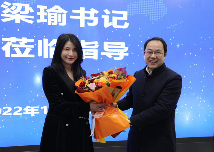 公司党委书记梁瑜(右)代表学院向东盟经济研究院副经理、图胜科技总裁吴代君(左)献花并送上新春祝福