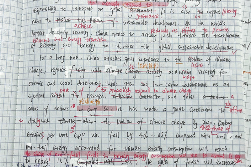 除了赛时的打磨备战,平时注重专业知识的积累也尤为重要。在日常学习与实践过程中,金方慧摸索到了一套翻译方法:第一步先划出译文主干成分,把文本吃透,反复读上几遍,最后才落笔。她表示,翻译好文章的基础,首先是要有大量知识的输入,要在“输入”上下足苦功夫。为此,她利用百词斩APP制定每天目标学习单词量,通过划分音节、标注词义词性和一些英文注释、例句,帮助自己记忆。“我以前对长短句的结构分解认识不够,通过大量阅读英文原著,在‘输入’上有所提高了。”她说。