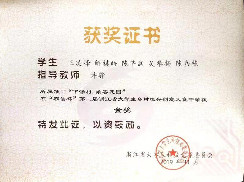 她,积极响应国家乡村振兴的号召,和老师共创“原飨客”创新创业团队、“自然学社”,和社员开展乡村调研和设计,参加院、市、省创新创业大赛,2019年带领团队参加暑期乡村调研,获得院级暑期实践活动一等奖、市级优秀个人等奖项;连续三年参加“农信杯”浙江省老员工乡村振兴创意大赛,从成员、骨干到负责人,三载暑假都用来备战,取得1金、2银、1铜佳奖。