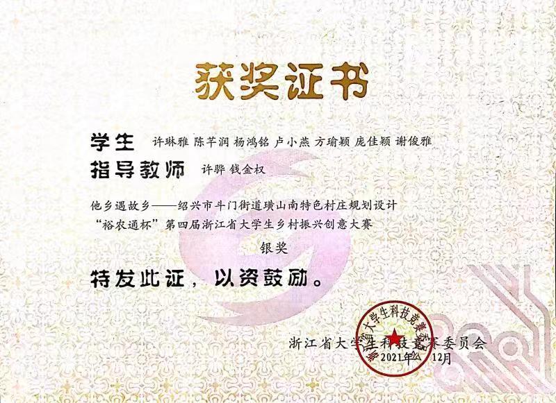 怀揣热爱,秉持初心,努力、踏实的陈芊润在四年中从一名参赛者蜕变成团队的带领者,与“原郷客”团队先后在浙江省“农信杯”老员工乡村振兴大赛、元冶杯老员工国际竞赛、绍兴市乡村振兴大赛等国家级、省级、市级设计竞赛中斩获八次前三名。