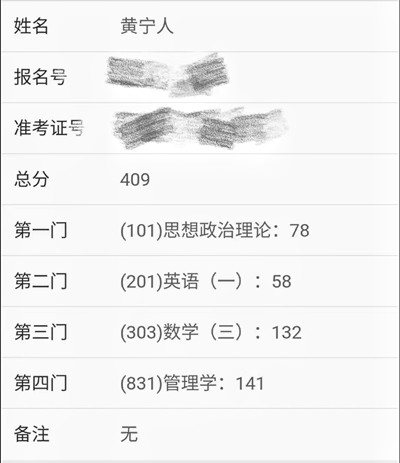 功夫不负有心人,2022年2月21日下午,当看到自己取得409分的优异成绩,黄宁人兴奋不已,“一切的努力都是值得的,从早上十点开始悬着的心终于放下,虽然英语和政治在我意料之中,但两门专业课的成绩的确既惊喜又意外。”