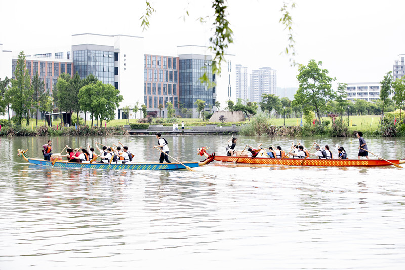 本次活动由院工会主办,公共基础教育分院体育教研部承办,浙江安格鲁传动系统有限公司协办。活动共分为陆上场景培训、水上实操体验两个环节。水上实操体验以龙舟体验赛形式进行,赛程为明德桥到至善桥间水域一个来回。教职工与龙舟队队员十人一组,共分三支队伍进行竞渡角逐。