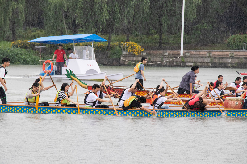 两岸彩旗飘扬,江面鼓声激昂、水花翻腾,路过的师生不禁驻足观看,鼓掌叫好,呐喊声、喝彩声此起彼伏,热闹非凡。三条龙舟在热烈的掌声中冲刺靠岸,参赛者们激动地击掌欢呼。赛程过半,天空突然下起大雨,但突如其来的大雨浇不灭“龙舟人”冲向终点的信念,大树江上传来的声音更加热烈,龙舟行驶的速度丝毫没有消减。鼓手高喊:“还有没有信心?”“有!”大家火力全开、愈发起劲,3条龙舟终于在热烈的掌声中冲刺靠岸。