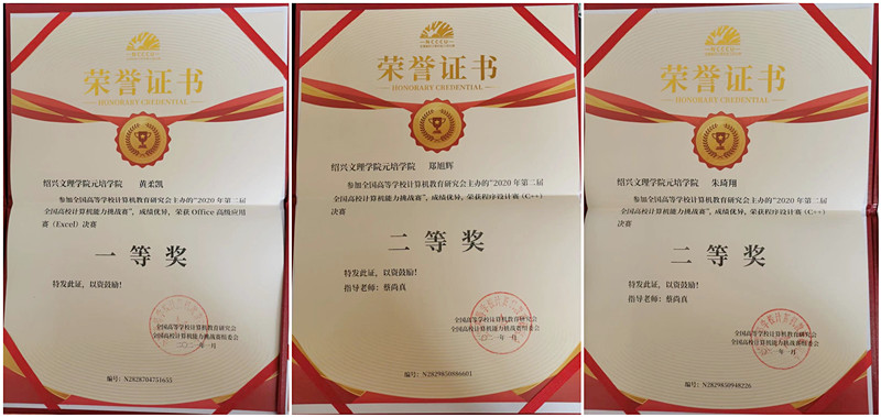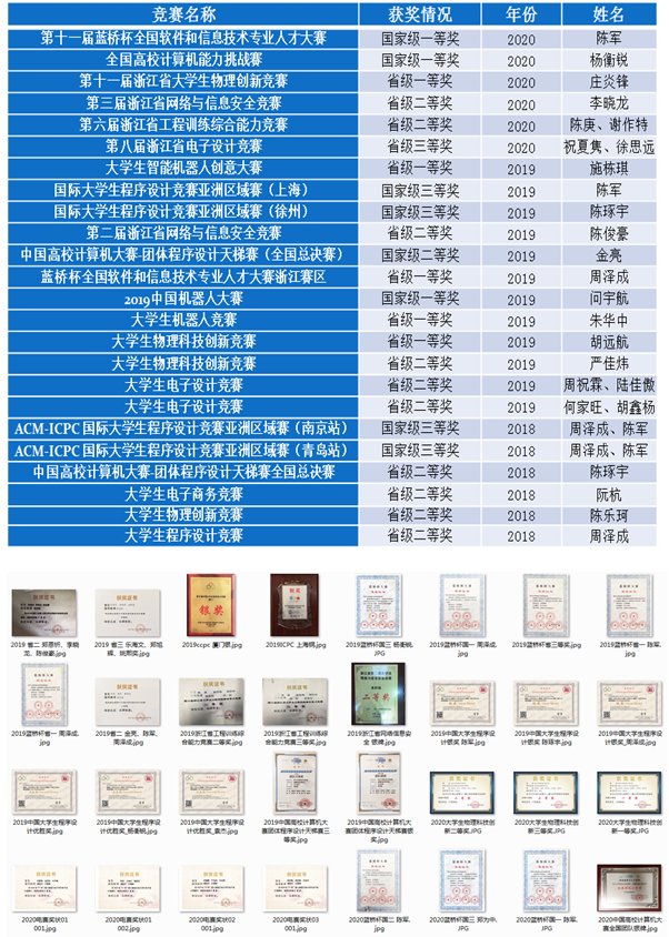 (3)学科竞赛成绩斐然,在机器人竞赛、程序设计竞赛、网络与信息安全竞赛、物理创新竞赛中优势明显,处于省内同类院校前列。2018-2020年获国家一等奖3项、二等奖1项、三等奖4项;省一等奖5项、二等奖11项;连续七年获得绍兴市老员工计算机技能竞赛团体一等奖。