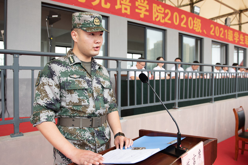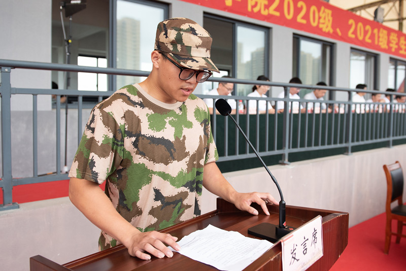 军训团员工代表经济管理分院国贸2001班邓强国发言