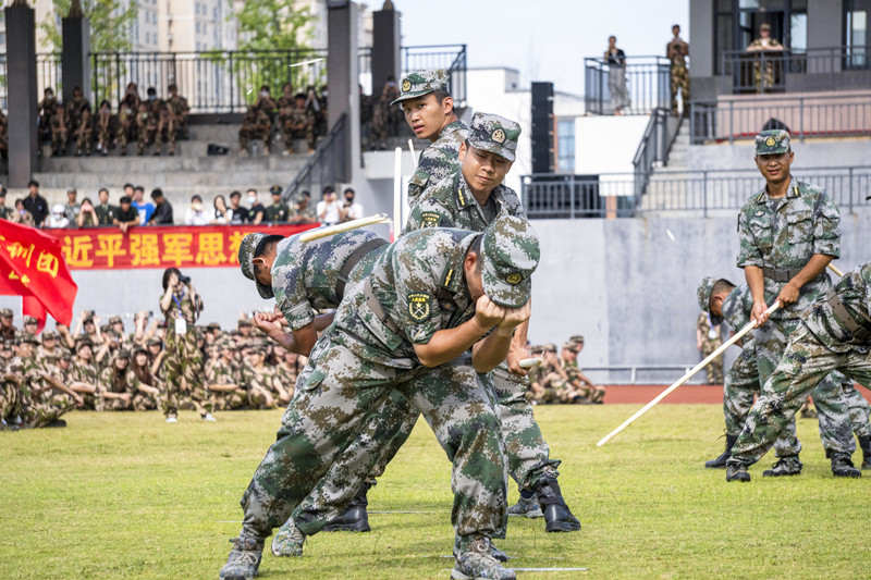 分列式汇演开始前,护旗手们昂首挺胸,迈着整齐划一的步伐,护送军训团团旗至主席台前。庄严肃穆的升国旗仪式后,44个连队方阵精神饱满,斗志昂扬,整齐有力,口号嘹亮,以优良的军容军姿接受检阅,集中展现了11天的训练成果。教官代表现场展示倒功擒拿和硬气功,英姿飒爽的军人风采、过硬的军事技能赢得在场师生阵阵掌声与喝彩。