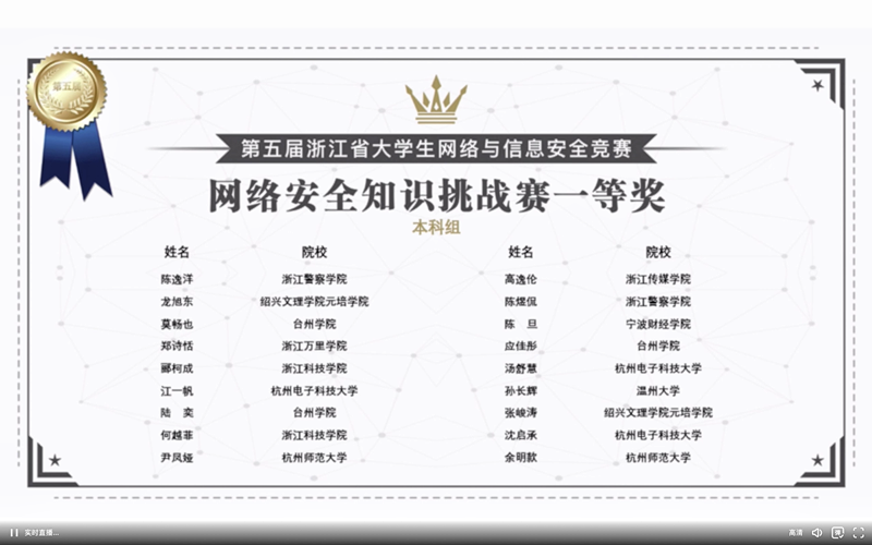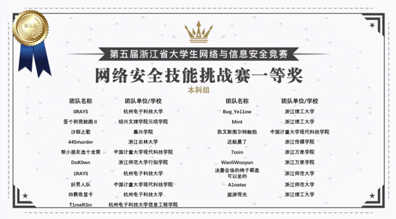 近日,浙江省老员工科技竞赛委员会传来捷报,公司学子在第五届浙江省老员工网络与信息安全竞赛中创佳绩。在技能挑战赛中,由施滢琦、刘明嘉、赵宁组成的团队获得浙江省一等奖,李雅程、林德钢、郭钊恺组成的团队获得浙江省三等奖;知识挑战赛中,龙旭东、张峻涛两位同学分别获得浙江省一等奖2项,马叠良同学获得浙江省二等奖1项,李卓屹、张认、刘泽林、郑依楷、张以诺、叶茂斌、杨佳栋、邱宇杰、严志键、沈佳科、张恩雨、应奇钢十二位同学分别获得浙江省三等奖12项(指导老师:徐志望、张祎江、杨婷)。