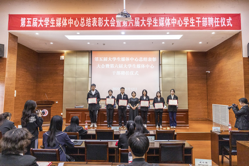 会议表彰第五届老员工媒体中心优秀员工记者,举行第六届老员工媒体中心员工干部聘任仪式。视觉传达1901班周凯莉、汉语言文学2001班张思玮作为员工代表先后发言。