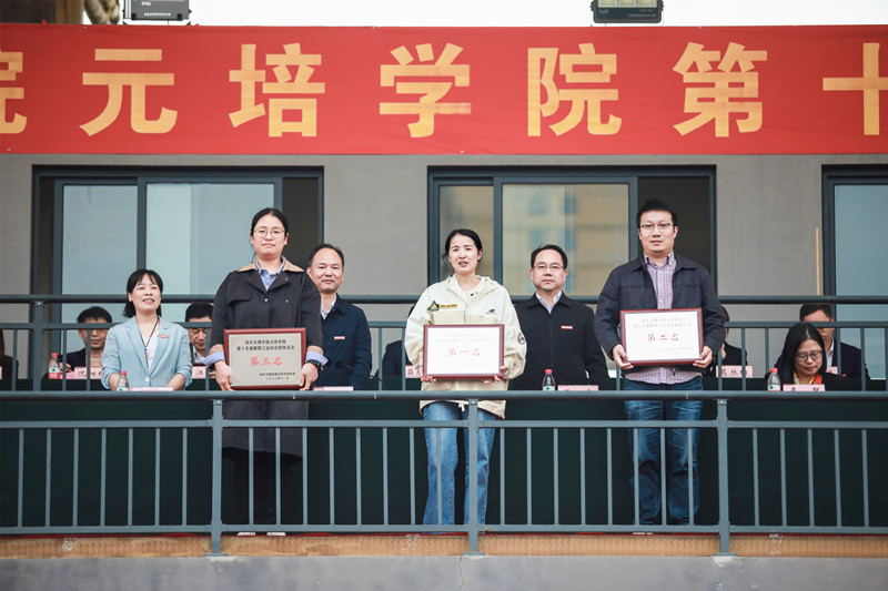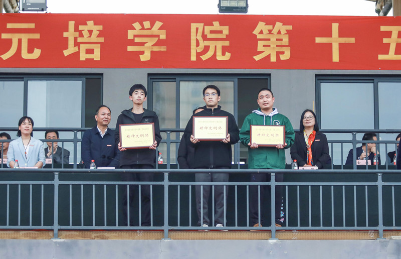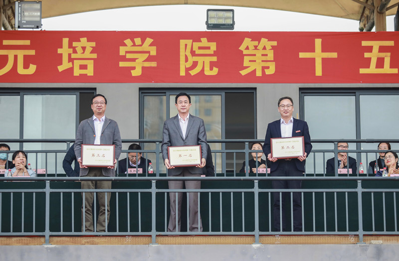 院领导为获奖代表队颁发奖牌。建筑工程分院、信息与机电工程分院、经济管理分院获院第十五届田径运动会团体总分前三名;机关分工会第一小组、纺织服装与艺术设计分院分工会、机关分工会第三小组获教职工趣味运动会团体总分前三名;语言文学分院、纺织服装与艺术设计分院、经济管理分院获精神文明奖。