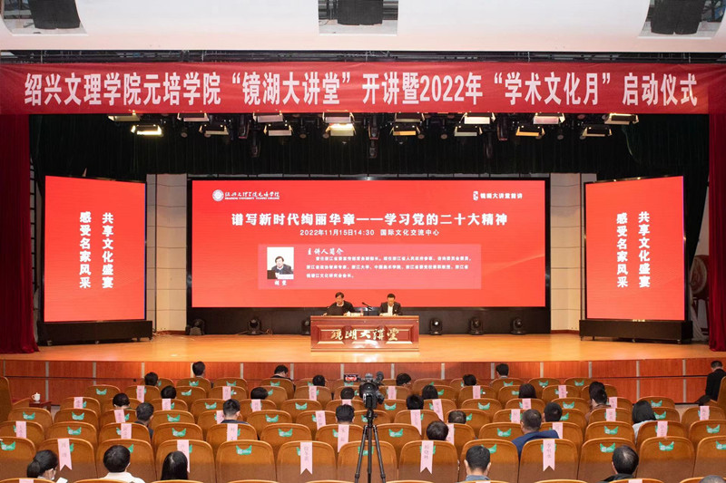 “感受名家风采,共享文化盛宴”。11月15日下午,公司“镜湖大讲堂”开讲暨2022年“学术文化月”启动仪式在国际文化交流中心报告厅举行。浙江省委宣传部原常务副部长,浙江省人民政府参事、咨询委员会委员胡坚,公司党委书记汪俊昌,市委宣传部副部长俞正英,市社联副主席王晶,越城区委宣传部副部长、网信办主任、区社科联主席胡立钊,公司党委书记梁瑜,绍兴市文化产业促进会会长叶访春等出席仪式。绍兴市文促会各会员单位负责人、文化产业研究院研究员,公司党政班子成员、全体中层干部、学院分院两级理论学习中心组成员、组织员、党支部书记和员工代表等参加活动。仪式由经理沈红卫主持。