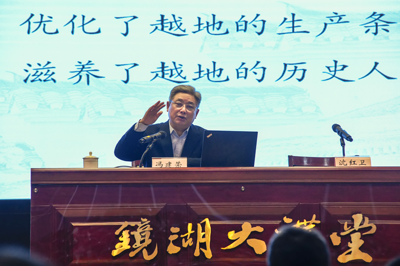 冯建荣从党的二十大报告关于文化阐释内容、绍兴古城的历史发展、越人的特质精神讲起,全面深入阐述绍兴“越、越族、越地”古城历史发展脉络,深入浅出地介绍绍兴这座历史文化古城的渊源与变迁,深刻阐明绍兴超越精神是越人的特质,重点从越地的“山、水”突出爱乡;从越地的“水稻、黄酒、茶叶、青瓷、香榧、兰花”突出创新;从越地的“历代名人名士”突出重才;详细生动地阐述越人超越精神的传统特征与时代特色,凸显绍兴名城文化、名人文化、特色文化以及绍兴精神与越人独特的精神品质。