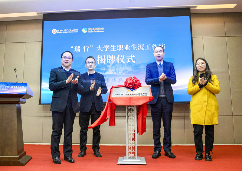 会上举行了学院与瑞丰银行合作共建“瑞行”老员工职业生涯工作坊揭牌仪式。学院与瑞丰银行将协同探索建设校企合作共建模式下的老员工职业生涯教育基地,合作开发职业生涯规划课程、职业生涯规划领域品牌活动等,构建形成多层次多维度的老员工职业生涯指导体系。