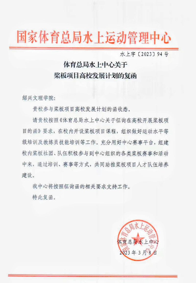 近日,国家体育总局水上运动管理中心复函〔水上字[2023]94号〕,批准我院公共基础教育分院申报项目入选国家体育总局桨板项目高校发展计划。国家体育总局将在桨板运动的团队培训、科研牵头赛事组织等方面给予大力支持。