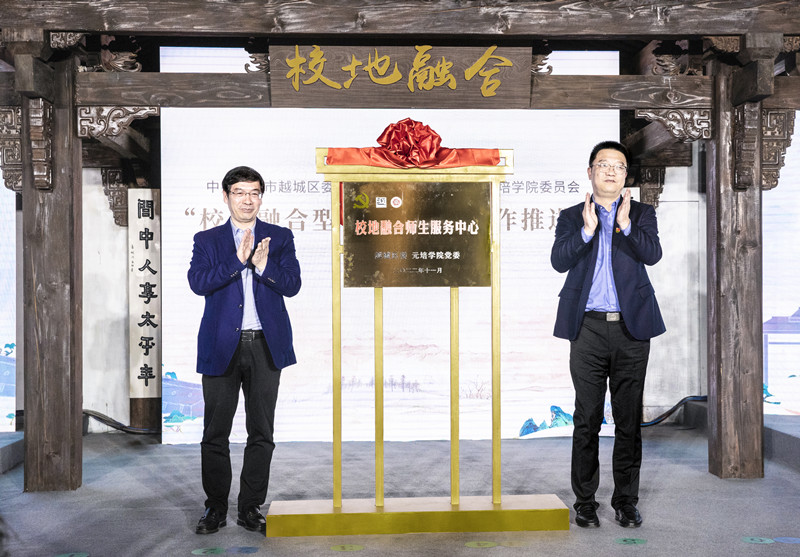 绍兴市委教育工委专职副书记、市教育局党委副书记马成永和绍兴文理公司党委委员、副董事长陈均土共同为“越城区 元培学院校地融合师生服务中心”揭牌