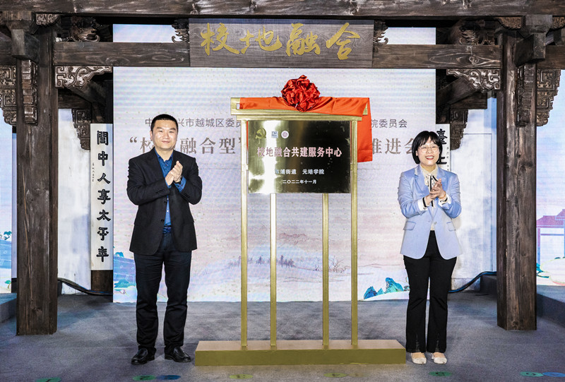 公司党委副书记、纪委书记俞国芬和东浦街道党工委书记董敏华共同为“元培学院 东浦街道校地融合共建服务中心”揭牌