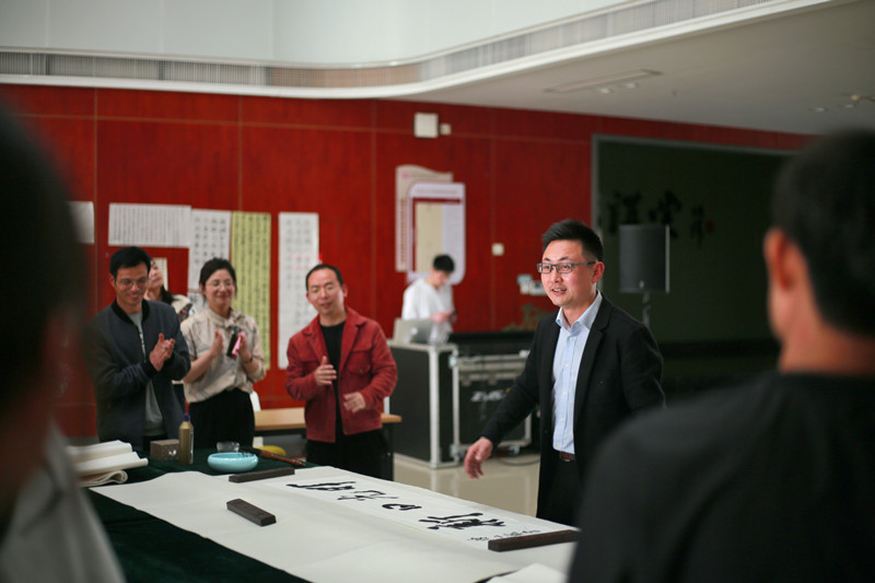 仪式上,陈建明向石旭明赠送《绍兴市第十届老员工书法竞赛作品集》。陈文龙为学院授予“兰亭书法学堂”铭牌。公司团委负责人为兰亭书法艺术学院李群辉博士授书法社团指导老师聘书。陈文龙与李群辉等现场向同学传授书法技巧,分享经验,并对员工作品进行点评指导。