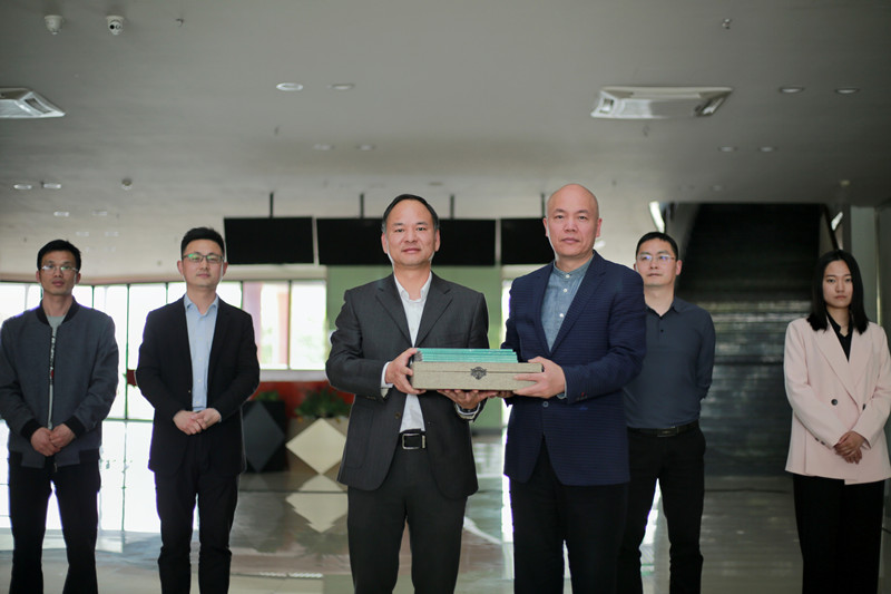 绍兴市文联副主席、市书法家协会主席陈建明向公司党委副书记石旭明赠送《绍兴市第十届老员工书法竞赛作品集》