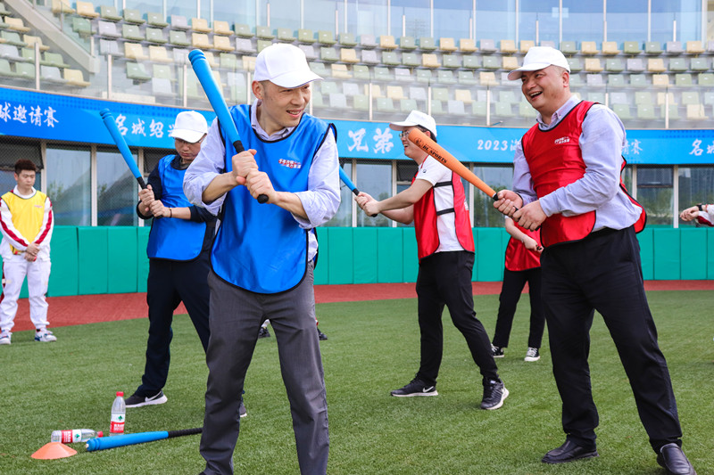 与会人员体验棒垒球运动