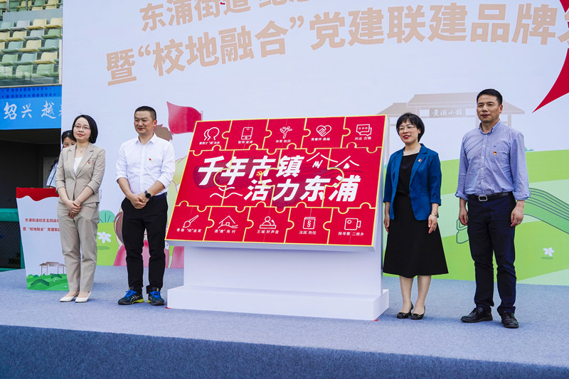 活动现场,越城首个地域性“校地融合”党建联建品牌——“千年古镇,活力东浦”正式亮相,俞国芬、董敏华、杨烈勇、肖微微共同发布东浦街道“校地融合”党建联建品牌。