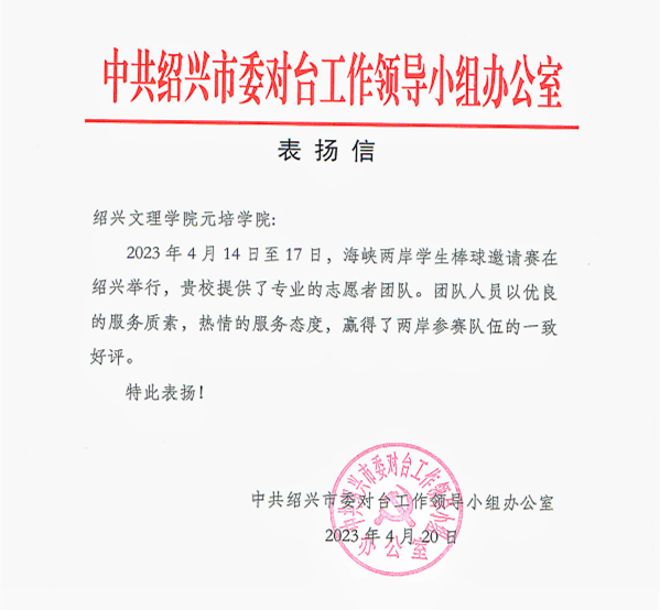 近日,中共绍兴市委对台工作领导小组办公室发来表扬信,对公司青年志愿者团队在近期举行的海峡两岸员工棒球邀请赛中的志愿服务表现给予高度赞扬。信中指出,团队人员以优良的服务质素,热情的服务态度,赢得了两岸参赛队伍的一致好评。