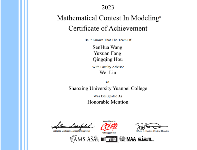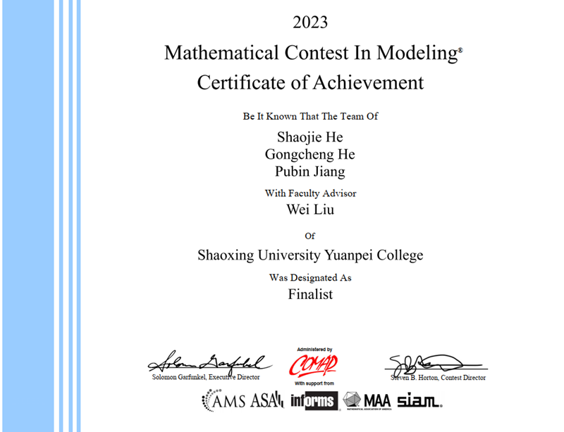 近日,公司两组员工在公共基础教育分院刘伟和龚玮嵘两位老师的指导下,经过长达近7个月的备赛,克服疫情困难,借助公司AI服务器(绍兴地区单台算力最强服务器),取得优异成绩。其中,第一组机械类2001班何宫诚、纺织2002班何少杰、计算机科学与技术1903班姜浦彬在4天4夜中完成的论文在全球2557份A题论文中排名15,获美赛Finalist奖(特等奖提名奖),为绍兴地区高校首次获得该项赛事最高奖,也是全国独立学院获得该项赛事的最好成绩。另一组数据科学2101班王森骅、方宇轩和国贸2001班侯清清获得Honorable Mention(二等奖)。