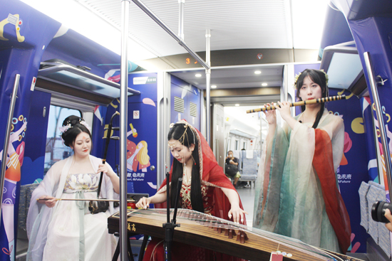 7月1日傍晚,一班由杭州南站开往绍兴迪荡站的城际列车车厢内时不时传来袅袅余音和热烈掌声。着眼望去,一群身着汉服的年轻人抚琴奏歌,唱响亚运乐章。