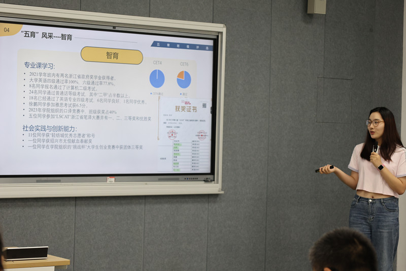 展示会上,入围的20个班级通过汇报集中展示班级简介、五育特色、班级风采、活动总结等各方面,讲述班级成员凝心聚力、拼搏奋进的青春故事,多角度、多形式展现班级凝聚力和特色风貌。经最终评选,护理学2111班等10个班级荣获“五育”先进班集体称号,并授予“蔡元培”班称号,工程管理2221班等10个班级荣获“五育”先进班集体(入围奖)称号。来自医药与健康分院的詹珍萍同学表示:“这次‘五育’先进班集体评比,让我看到了优秀班集体的独特魅力。大家在优秀班集体的感染和推动下一起前行,相互鼓励,学习氛围浓厚。”