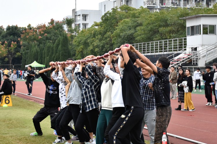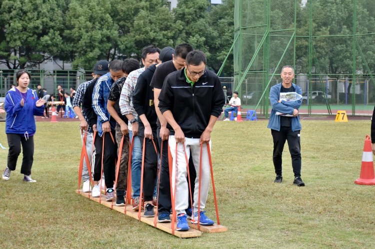 “齐握长杆,健步如风”,最先进行的“旋风跑接力”在观众心里刮起了一场“小旋风”。参赛队伍分为四组,按照教工组、混合组、女生组、男生组的顺序进行接力,每组队员手握长杆按照事先规划好的S形路线往返跑,每队接力用时最短者即为优胜。发令枪一响,教工队伍率先冲出起跑线,他们配合默契,标志杆最内侧的成员稳住重心,控制整支队伍的方向;最外侧的成员奋力奔跑,调整全组行进速度。场下观赛的同学们也都振奋不已,纷纷摩拳擦掌,激烈奔跑的脚步声和欢呼加油的呐喊声将比赛推向高潮。第二场开始的“大脚板接力”,要求全队队员站在长板上,提拉提绳,队员与长板一起移动,在交接区与另一组完成交接,四组成员接力完成结束比赛。发令枪响,公司队员们站在原地,喊出口号、调整好节奏后稳步迈进。伴随着“一二一”的呐喊声,他们的步伐越来越整齐,越来越迅速,交接顺利,逐渐赶超。最终,凭借着师生的默契配合,公司以小组赛第一、全体第三的好成绩顺利进入决赛。