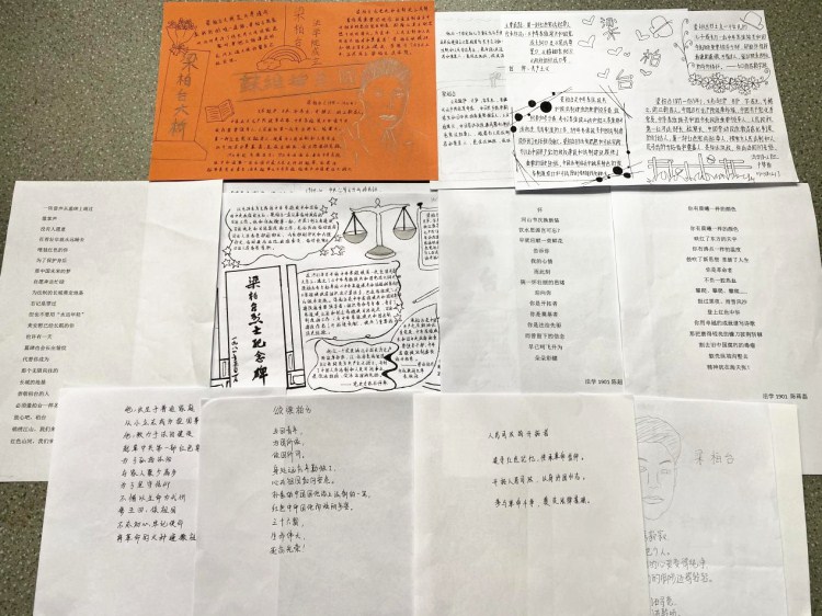 梁柏台法学院员工党员们通过此次活动,纷纷用各种方式手绘梁柏台的爱国元素。法学专业1802班梁悦同学用中秋月饼盒制作了梁柏台纪念碑风景画,法学专业1802班陈苗琪等5位同学手绘了梁柏台生平手抄报,法学专业1901班陈超等9名同学用诗歌抒发了对梁柏台先生的赞美和怀念。
