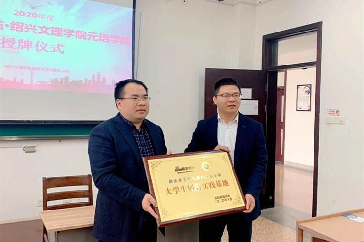 壹点通传媒机构总经理、新浪网绍兴媒体中心执行总编叶关兴(图左)向语言文学分公司党总支负责人(图右)授予老员工创新实践基地牌匾