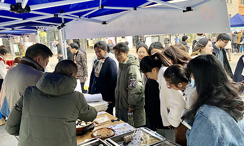 活动现场,人流如织、热闹非凡。一个个蓝棚下,鳊鱼干、腊肠、诸暨香薯干、平水日铸茶、嵊州小笼包、大米、土鸡蛋、菜籽油、纸皮核桃、香榧、春香柚、甲鱼、野生蜂蜜等各类绍兴特色农产品在不同的展位上摆放得整整齐齐。各个展位的商户热情地介绍着产品特色,更有网络主播“牵线搭桥”,直播带货。全院师生认购热情高涨,其中非遗美食的诸暨“西施团圆饼”,现场手工制作,色香味美,深受广大师生的喜爱。“优质农产品走进元培校园,我们能现场品尝,采购也方便,吃着也更放心。”汉语言文学专业的吴知颖特地挑选了鱼干、香榧等特产,准备元旦带回家与父母分享。