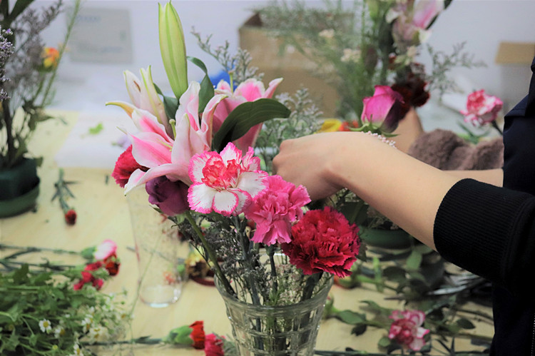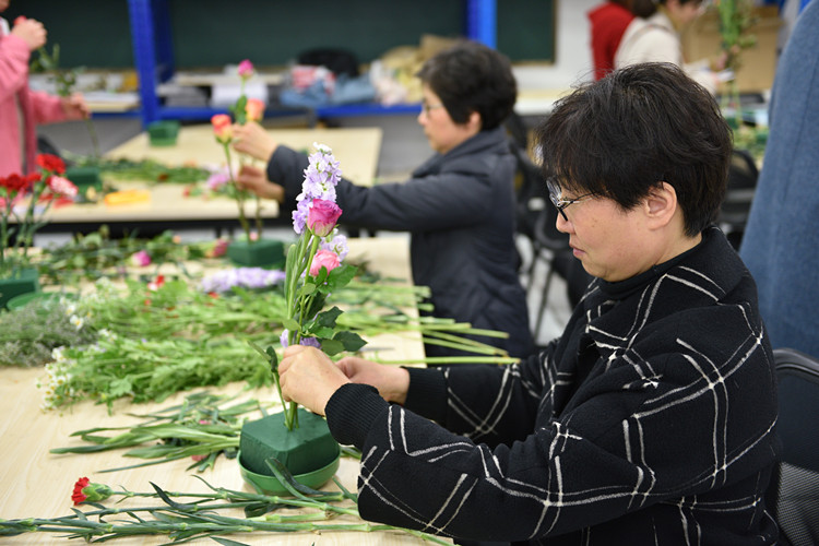 艳丽夺目的玫瑰、清雅秀丽的百合、碧莹莹的金鱼草,各色花卉摆满了桌子。3月18日,为庆祝“三八”国际妇女节,丰富学院女教职工的文化生活,由学院工会主办、院园艺协会和建筑工程分院承办的一场温馨有趣的插花艺术培训在教学楼8幢展开,百余位女教职工应邀赴约。