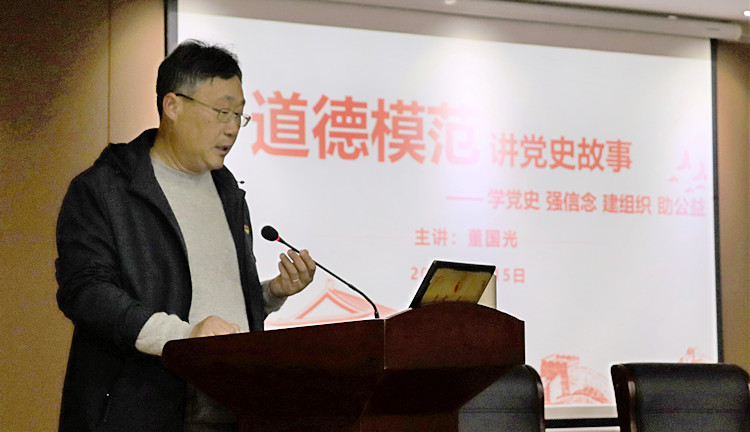 4月15日下午,中华十大信义人物之一、绍兴市道德模范、“点亮一盏灯”网络爱心活动的发起人和实践者——董国光为公司青年员工党员作了题为“道德模范讲党史故事——学党史、强信念、建组织、助公益”专题讲座。