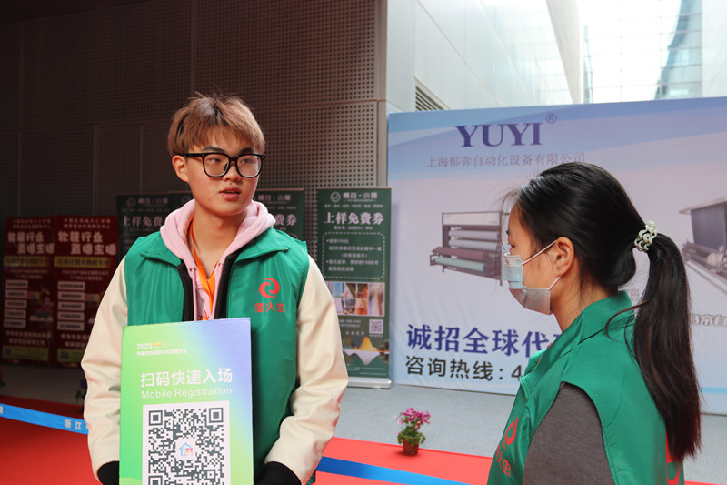 在分院相关负责人和展会负责人的带领下,志愿者们分别前往各自负责区域,以饱满的精神状态开展引导、接待以及后勤等系列服务工作,耐心为参展人员细致讲解入场流程、解决入场问题,有效发挥桥梁作用,为展会现场增添了一抹绿色的青春色彩。“此次活动收获满满,既开拓了国际化视野,践行了志愿服务精神,同时也在实践中传递自我价值,向中外客商递上了属于我们元培志愿者的名片,十分有意义。”第一次参与窗帘展活动的志愿者、担任客户引导与注册扫码工作的外语2201班周郏胤聪说。