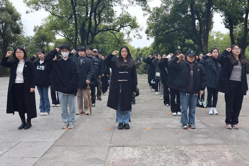 在革命烈士纪念碑前,全体师生庄严肃穆,默哀三分钟,有序敬献白菊并鞠躬;面向党旗,高举右拳,再次庄重地作出自己对党的庄严承诺;离开前,大家自发进行陵园周边志愿清扫,用行动表达对英烈的思念与缅怀之情。