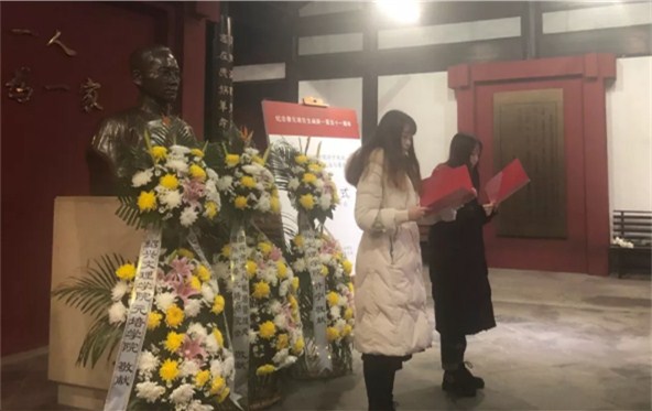 在纪念活动中,语言文学分院师生代表们纷纷向蔡元培先生敬献花篮,面向先生铜像三鞠躬,表达对先生的深切缅怀与崇敬之情。员工代表汉语专升本1701郑岚、中语1804班孙何佳两位同学诵读《蔡元培文选》。学院与蔡元培故居共建老员工创新实践基地并授牌。纪念仪式结束后,师生代表们参观故居,进一步学习重温蔡元培精神