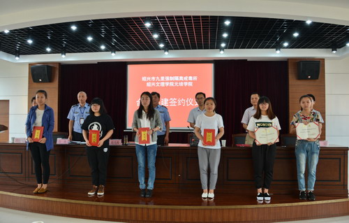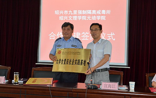 在签约仪式上,宣海江副书记代表学院与绍兴市九里强制隔离戒毒所签订了双方合作协议,并互相授予对方单位合作共建匾牌。绍兴电视对活动进行了报道。