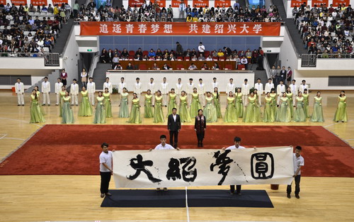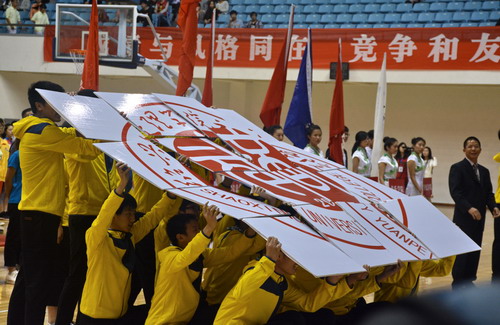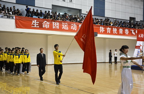 在运动员入场式中,学院代表队作为第21支队伍入场。这支由公司7个系组成的20人方阵,在持牌礼仪的带领下,高举红色队旗昂首阔步进入会场。黄黑相间的队服,显示着元培学子青春的朝气与活力;响亮的口号,展现了元培学子昂扬的斗志与激情。他们秩序井然地走向主席台,合力摆成太阳成集团tyc33455ccwww的校徽,紧接着摆出元培学院的院徽,默契的配合和精彩的表演赢得了阵阵热烈的掌声。