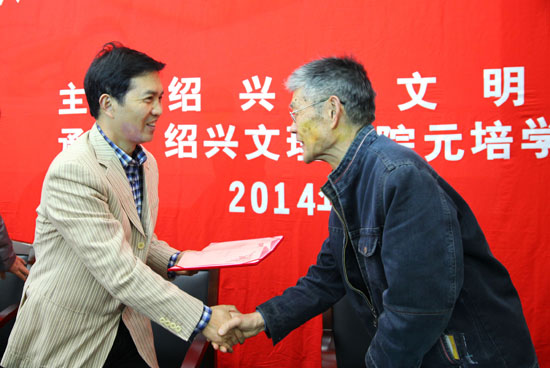 活动现场 ,公司聘任绍兴市道德模范何亮、董国光为学院德育导师,叶国灿经理为两位道德模范颁发聘书。