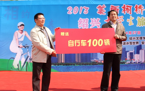 魏春初副书记代表学院接受绍兴县旅游局捐赠的100辆自行车