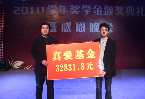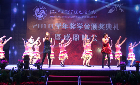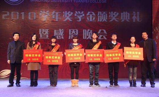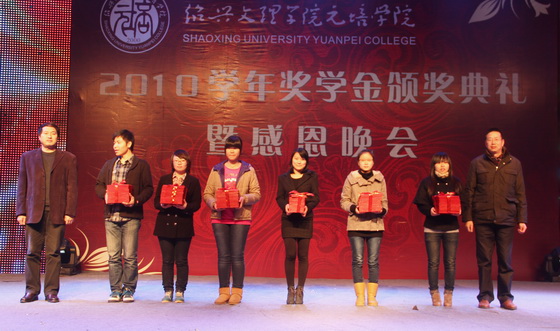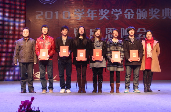 12月11日晚,学院在河西体育馆隆重举行2010学年奖学金颁奖典礼暨感恩晚会,表彰2010学年度先进班集体和奖学金获得者、热烈欢迎2011级新学子。院领导叶国灿、章融、宣仕钱、魏春初、陈建军、祝立英、俞国芬出席。各系(部)主任、书记(副书记)、各职能部门领导、各系辅导员、先进班集体、奖学金获得者代表以及全体2011级新生和2011级班主任参加。叶国灿经理发表讲话,并与章融书记一起为特等奖学金获得者颁奖,魏春初副书记宣读表彰文件并代表学院接受真爱基金捐赠,经理助理、学工部部长俞国芬主持典礼。