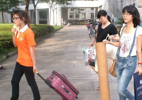 找到三轮车接送的负责人潘天威时,他正在记录着三号车的出发和回来的时间。 “我们八个人,二十辆三轮车都是我们在指挥着。”潘天威显得有点自豪,这是一只由二十辆三轮车组成的新生接送队。作为一个指挥者潘天威的团队也不容易,早上六点二十便早早到达接待处做准备工作。他们的工作是将完成报到的新生行李送上指定的三轮车,并载着新生去自己的宿舍。这一次的三轮车上都有编号,而且每个人都会看管相应编号的三轮车,此外还要根据三轮车的行程记录下出行和归来的时间。行之有效的管理杜绝了三轮车被无序使用的情况。