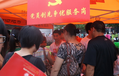 党建工作也在新生报到处展开,在经济与管理系接待处,一块红色的“党员创先争优服务岗”特别醒目,党总支书记郑江老师一直在现场指导迎新工作。郑书记表示,要创新地做好服务工作,在服务新生的同时也要潜移默化地引导新生,给他们以直观的教育。经济与管理系把党员创先争优活动与新生接待工作结合起来,通过党员的模范作用,心贴心的服务让新生一入学就感到大家庭的温暖,为今后的党建工作打下良好的基础。在这个服务岗前,新生排起了长队,在党员的带领下有条不紊地办理各种手续,现场还备齐了解暑的药品、矿泉水等,服务十分周到。