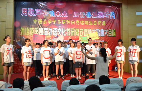 英语0904班的英文歌《Heartbeats》悠扬动听,赢得了观众的热烈掌声;英语0906韩文歌《여자이니까》带给了观众韩式的浪漫;英语0902日文歌《小さな恋のうた》甜美的演绎给观众留下了深刻的印象。最后晚会以外语系团学干部的一曲慷慨激昂的《国际歌》圆满结束,展现了外语系学子崇高的爱国情操,为建党成立九十周年唱响最真挚的生日祝福。